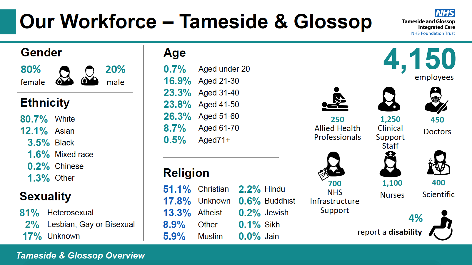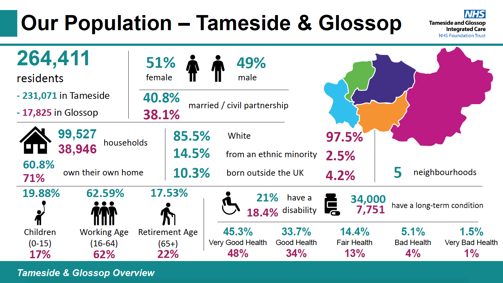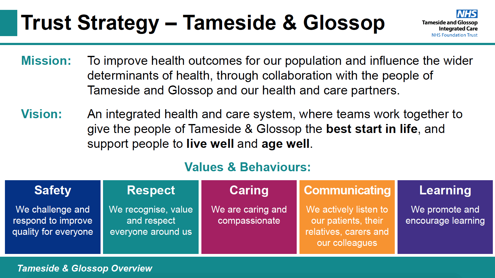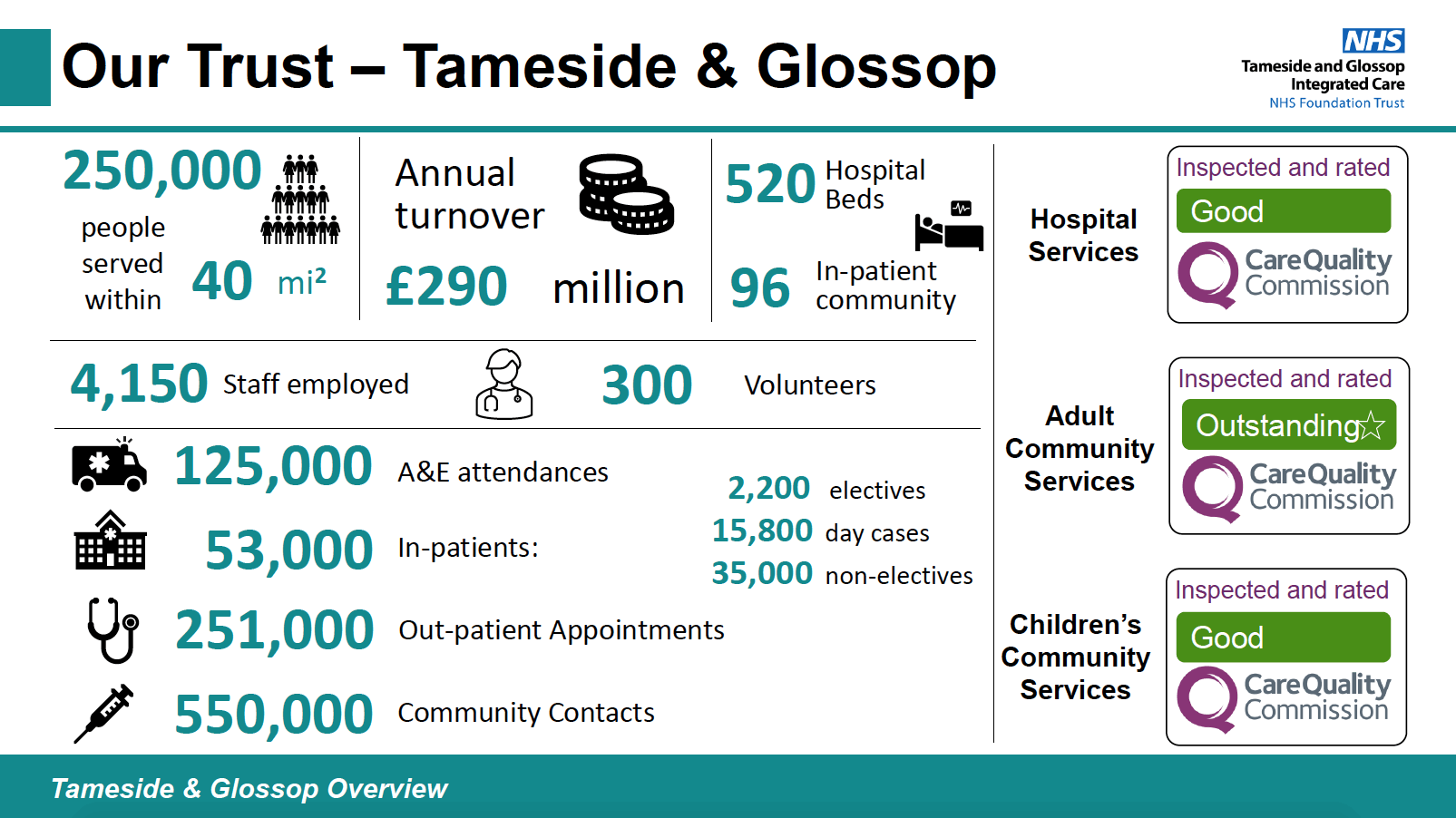 Tameside & Glossop Integrated Care NHS FT delivers acute hospital services from Ashton Under-Lyne as well as community health services for the borough of Tameside in Greater Manchester, and Glossop in Derbyshire. With an annual budget of around £290m and 4,150 staff support around a quarter of a million patients in Tameside, Glossop and from neighbouring Derbyshire