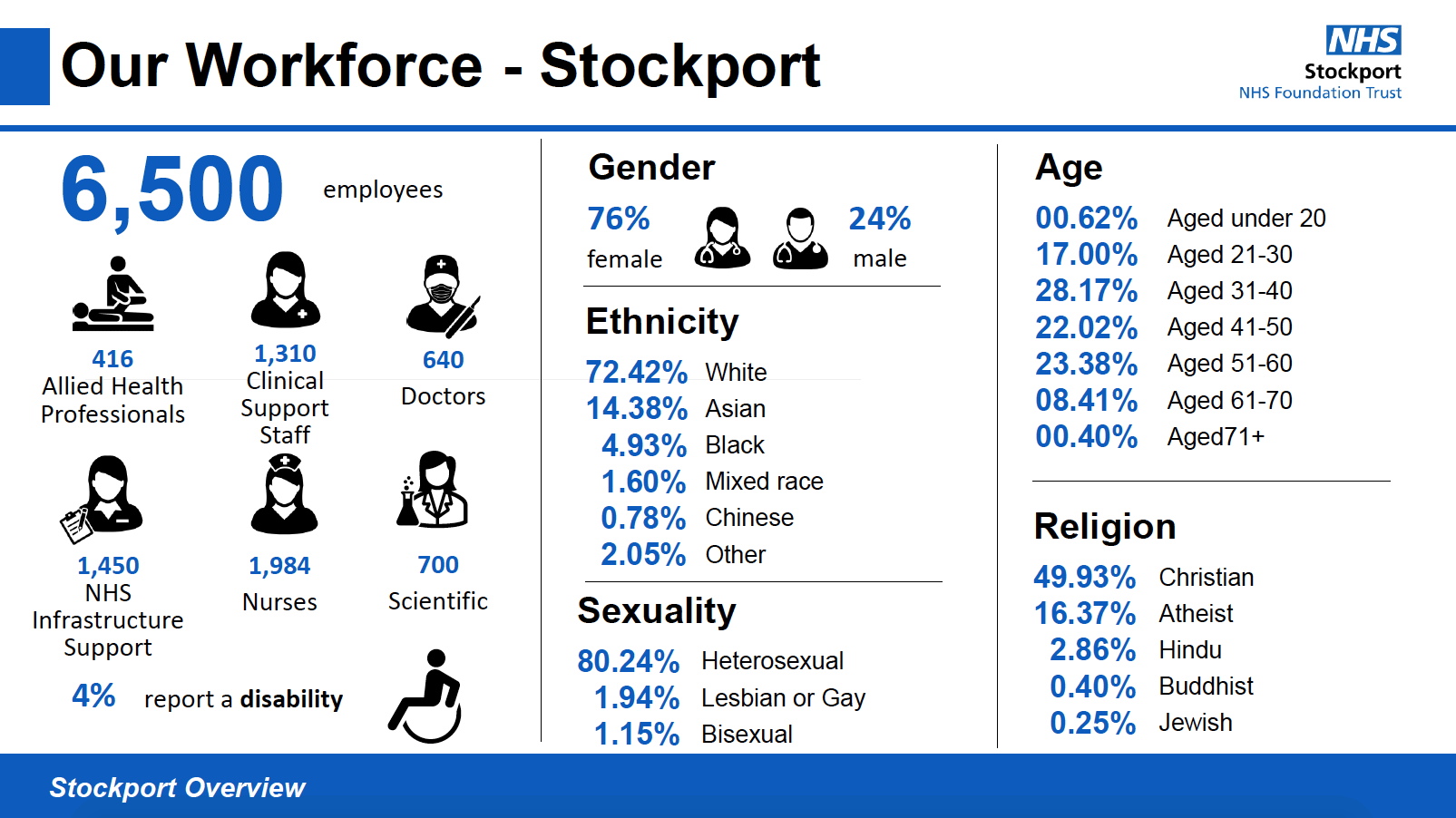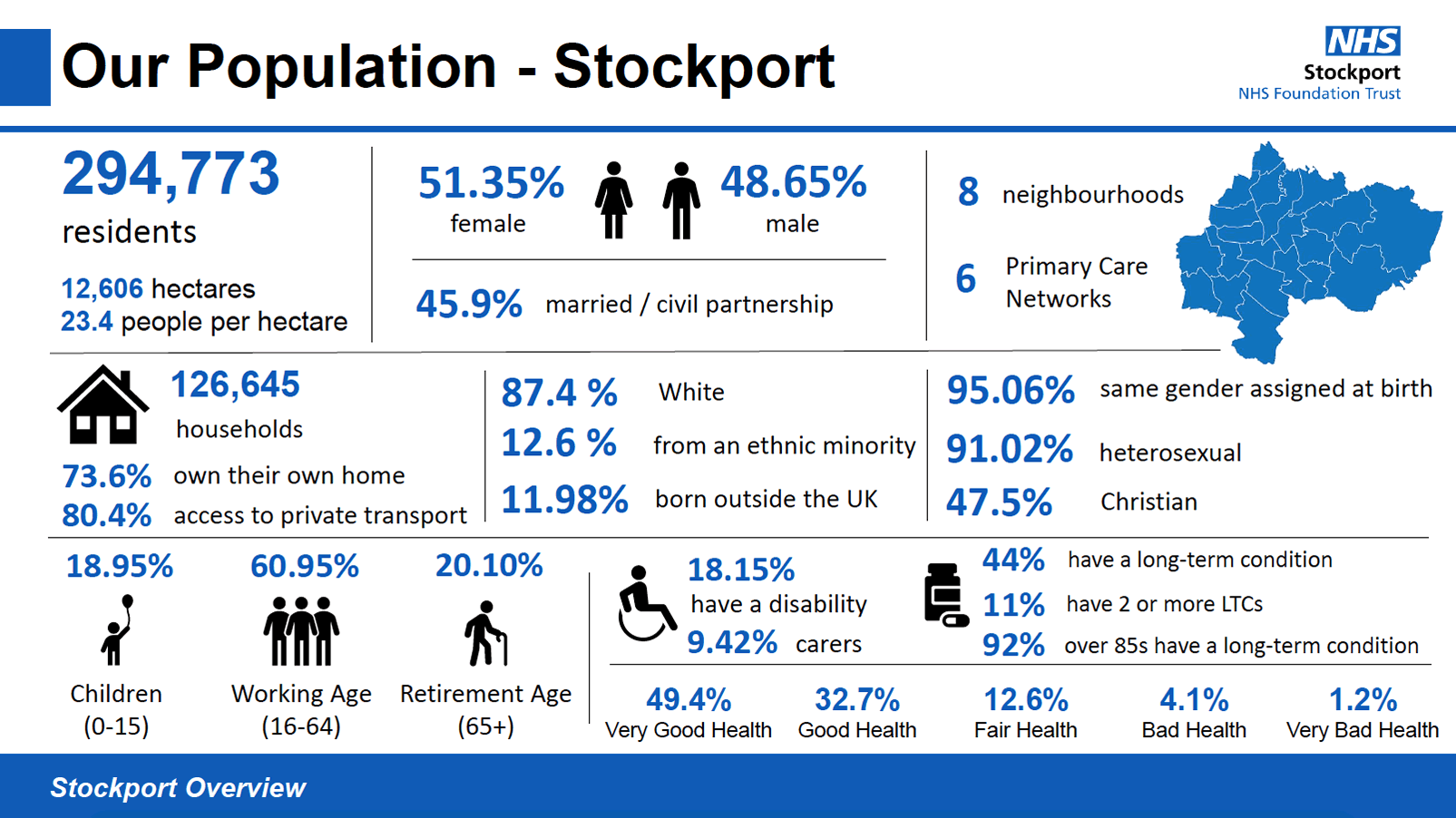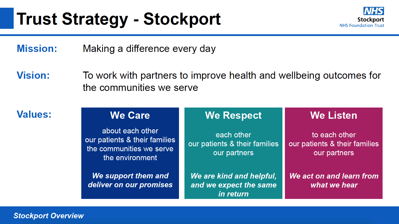 Stockport NHS FT is a leading provider of hospital and community health services in Greater Manchester. With a strong focus on clinical excellence, patient safety, and service innovation, we are dedicated to improving the health and well-being of the communities we serve. Our services include acute hospital care, specialist treatments, and extensive community-based health services. With an annual budget of around £400m and 6,500 staff, the Trust supports around half a million patients a year across Stockport, as well as patients from neighbouring Cheshire East and the High Peak area of Derbyshire